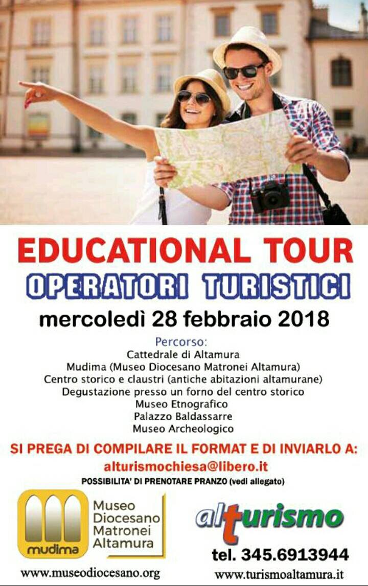 Gent.li Operatori turistici, vi informiamo che l’iniziativa EDUCATIONAL TOUR 2018 che si svolgerà nella Città di Altamura, mercoledì 28 febbraio, ha riscontrato un notevole successo visto il numero di iscrizioni pervenuteci: circa 70 partecipanti provenienti da Matera e provincia, e da tutta la provincia di Bari. Vi esponiamo il programma della giornata: ore 9:30 incontro …