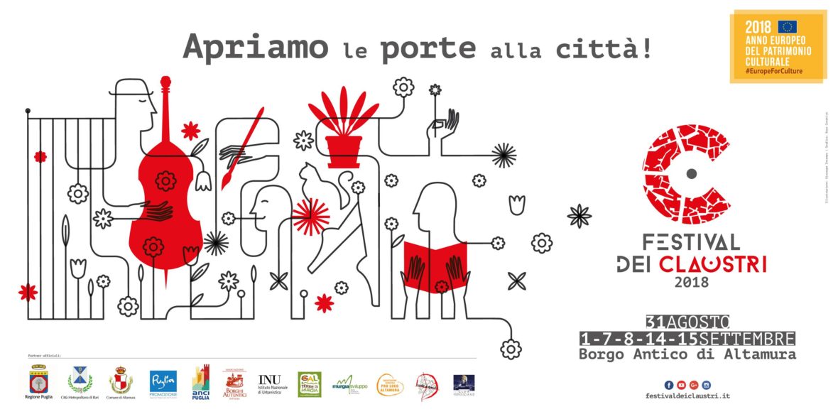 31 ago.-1 set./7 set.-8 set./ 14 set.-15 set. /// il MUDIMA al FESTIVAL DEI CLAUSTRI /// anticipazioni: https://www.youtube.com/watch?v=9992J0Fu_uM ///scarica il programma: www.festivaldeiclasutri.it L’iniziativa “Festival dei Claustri”, per la città di Altamura, assume un carattere sperimentale ed ha l’obbiettivo di favorire la diffusione dell’azione volontaria e partecipativa, sollecitando l’impegno da parte dei cittadini per la rigenerazione del borgo antico, …
